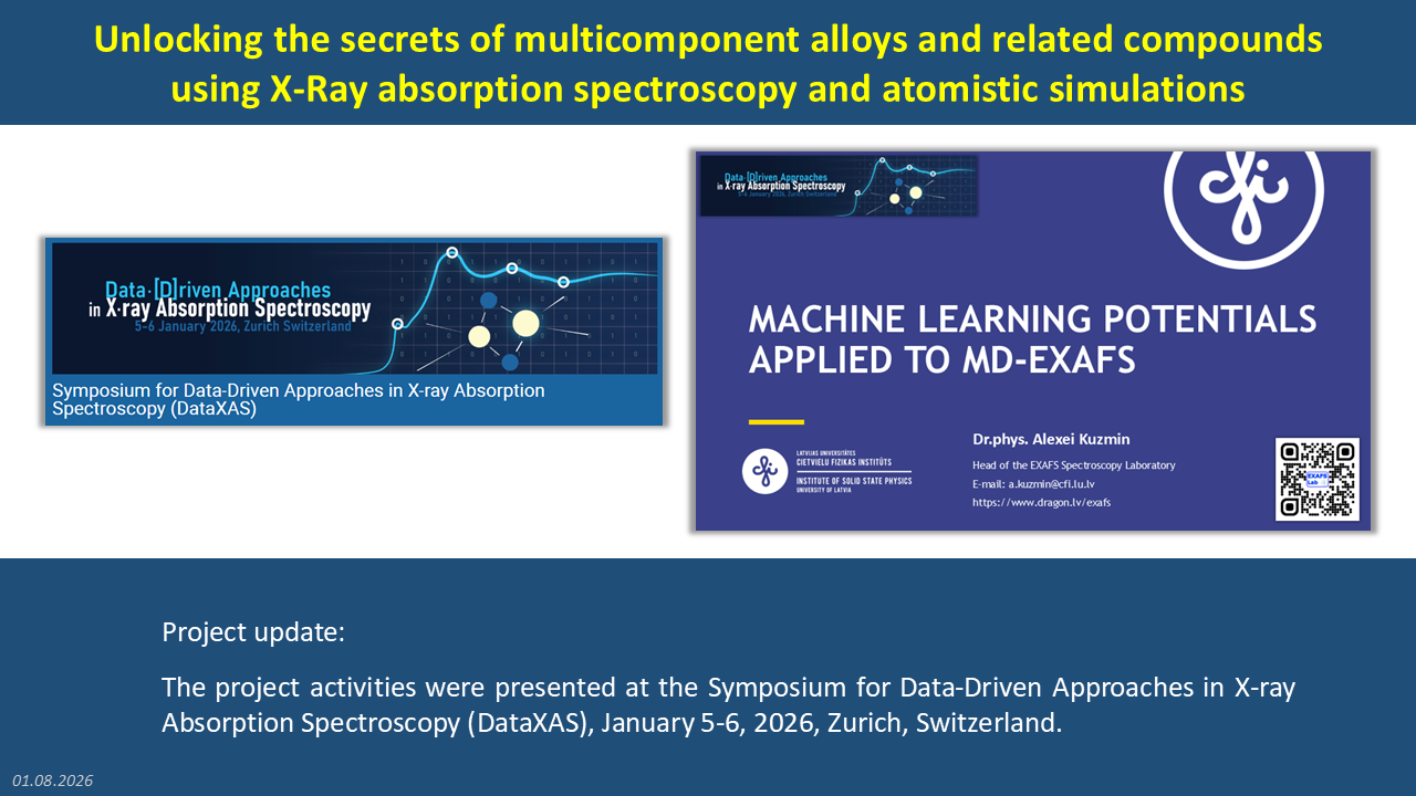Multicomponent metal alloys without the main element, called medium-entropy alloys or high-entropy alloys depending on the number of constituent elements, have been recognized as promising functional materials in the last two decades, which are of great importance in materials science due to several unique properties. These materials are very attractive for a wide range of the most demanding practical applications, such as energy storage and conversion, nuclear power, and biomedical applications. Therefore, their development and improvement will ensure a great impact on the development of industry and technology in the future and, in particular, on the implementation of the goals of the European Green Course and the achievement of the goals of European sustainable development. In this project, we aim to develop and apply an original methodology based on atomistic modeling and machine learning methods for X-ray absorption spectroscopy of multicomponent alloys at the atomic level to better understand the effects of short-range order and chemical composition on alloy formation and properties.