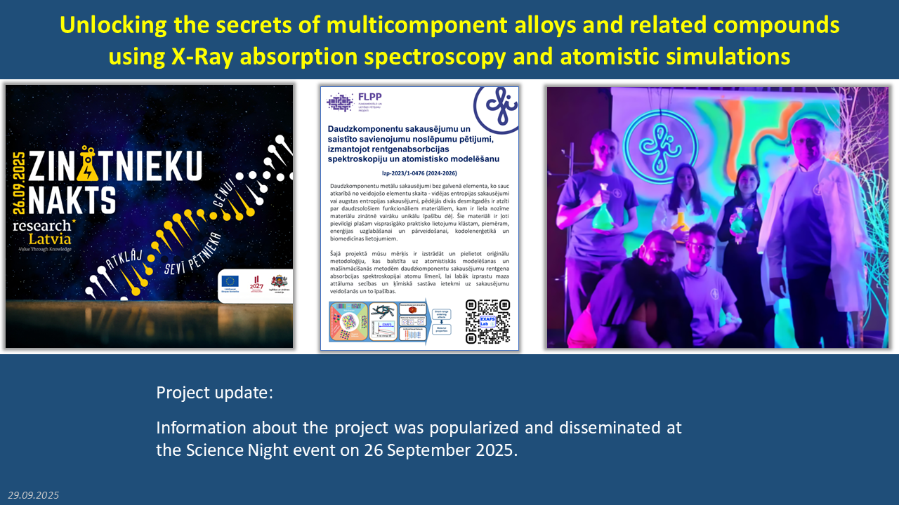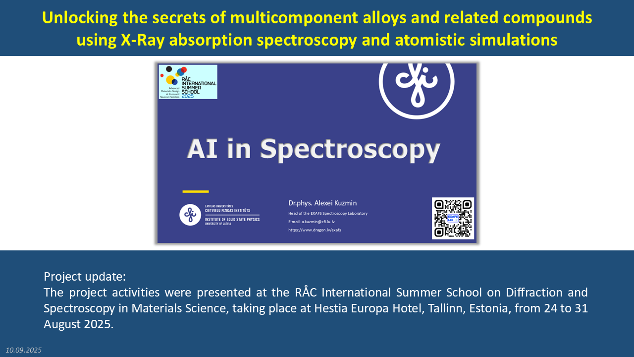 Multicomponent metal alloys without the main element, called medium-entropy alloys or high-entropy alloys depending on the number of constituent elements, have been recognized as promising functional materials in the last two decades, which are of great importance in materials science due to several unique properties. These materials are very attractive for a wide range of the most demanding practical applications, such as energy storage and conversion, nuclear power, and biomedical applications. Therefore, their development and improvement will ensure a great impact on the development of industry and technology in the future and, in particular, on the implementation of the goals of the European Green Course and the achievement of the goals of European sustainable development. In this project, we aim to develop and apply an original methodology based on atomistic modeling and machine learning methods for X-ray absorption spectroscopy of multicomponent alloys at the atomic level to better understand the effects of short-range order and chemical composition on alloy formation and properties.