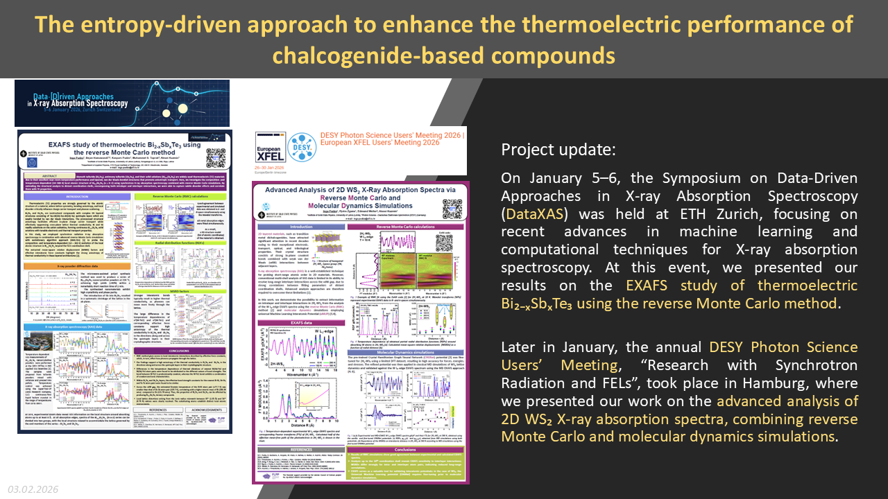 Thermoelectricity has a great potential to increase energy efficiency by converting waste heat into electricity and limiting global warming. Recently, new so-called high-entropy multicomponent compounds containing at least five principal elements in similar concentrations, with excellent functional and mechanical properties have emerged. Such materials are promising, yet little explored for thermoelectric applications. In this fundamental project, we propose to develop the low, medium, and high entropy multicomponent solid solutions based on layered metal chalcogenide compounds for thermoelectric applications and investigate the correlation between their structure and properties using synchrotron radiation X-ray absorption spectroscopy combined with lab-based techniques and a set of advanced atomistic simulations such as reverse Monte Carlo (RMC), molecular dynamics (MD), and quantum chemistry calculations. The goal of this project is to explore the impact of individual components on the structure and thermoelectric properties of multicomponent chalcogenide compounds suitable for high-performance thermoelectric applications.